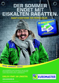 Der Sommer geht in der nördlichen Hemisphäre bekanntlich bis zum 22./23. September. Und weil das so ist haben sich die Marketingstrategen von Euromaster wieder was ganz tolles ausgedacht ;-))) Frühwechslerrabatte! D.h., wer ab dem 2. September bei der Michelin-Tochter zum Reifenwechsel oder Kfz-Service aufschlägt, bekommt für jeden nicht vergangenen Septembertag einen Euro Rabatt auf die Rechnung.