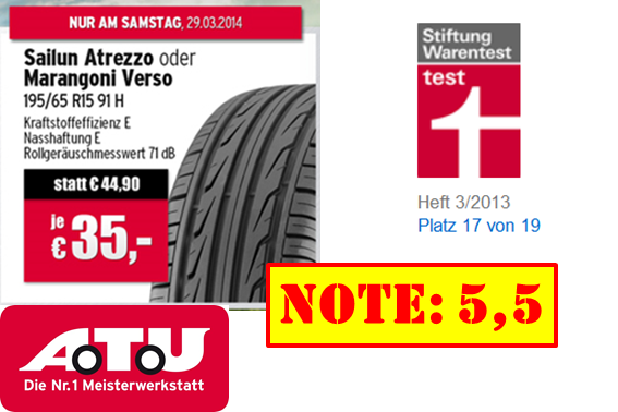 © Screenshots ATU-Newsletter, test, Montage: IAM-NET.EUChinesische Reifen haben bislang einen schlechten Ruf, nach Testergebnissen durchaus zurecht. Wieder einmal haben chinesische Sommerreifen in einem Test desaströs abgeschnitten – dabei waren sie noch nicht einmal die günstigsten Mitbewerber im Feld. Deutschlands "größte Werkstattkette" mischt im Discount-Fernost-Reifengeschäft vorne mit. Zusätzlich bieten wir für Sie einen Kundenaushang zum Thema an.