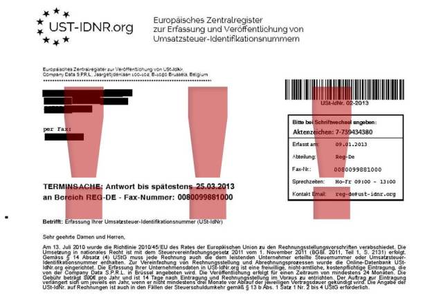 Update: Einer Ihrer Unternehmer-Kollegen hat uns dieser Tage ein Fax vom "Europäischen Zentralregister zur Erfassung und Veröffentlichung von Umsatzsteuer-Identifikationsnummern" zukommen lassen. In dem Schreiben wird der Betrieb aufgefordert, seine betrieblichen Angaben zu überprüfen und das Fax zurückzusenden. Die Masche wird auch über Emails mit einem Link zu einem vorausgefüllten Online-Formular durchgeführt!