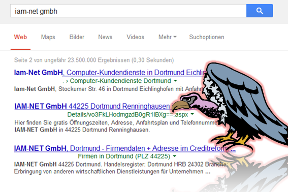 © IAM-NET GmbHGoogeln Sie einmal den Namen Ihres Unternehmens: Meistens haben Sie mit den Seiten, auf welche die Mehrheit der Suchergebnisse verweist, noch nie etwas zu tun gehabt. Wenn diese Daten rechtlich falsch dargestellt werden, kann Post vom Abmahnanwalt kommen – der reale und teure Irrsinn.