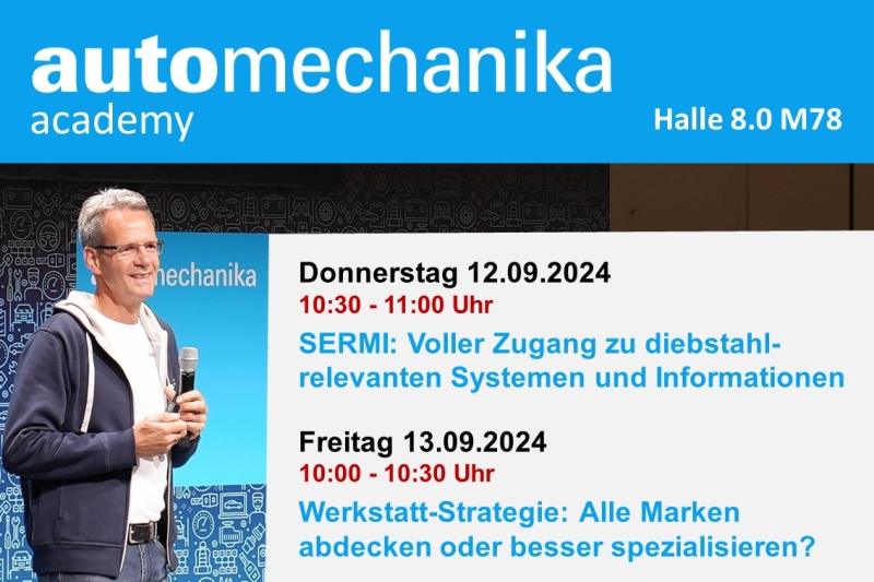 Die zunehmende Digitalisierung und neue technologische Entwicklungen stellen Kfz-Betriebe täglich vor neue Herausforderungen. Deshalb ist regelmäßige Weiterbildung wichtig. Nutzen Sie das vielfältige und kostenlose Angebot der Academy, das ein breites Spektrum an Vorträgen, Panels und Tech-Talks zu aktuellen Themen und Entwicklungen abdeckt. Auch wir sind auf der Automechanika Academy in Halle 8.0 M78 aktiv.