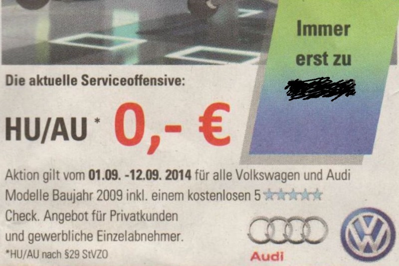 Einer Ihrer Unternehmerkollegen traute seinen Augen kaum, als er am 03.09.2014 die Zeitung aufschlug. Eine große Handelsgruppe, die in NRW als Vertragspartner in erster Linie Fahrzeuge der Marken Volkswagen und Audi vertreibt und für diese Serviceleistungen anbietet, wirbt für HU/AU inkl. einem 5-Sterne Check mit 0,- Euro. Wir stellen begründete Fragen und haben beim Landesverband des Kfz-Gewerbes NRW nachgehakt.