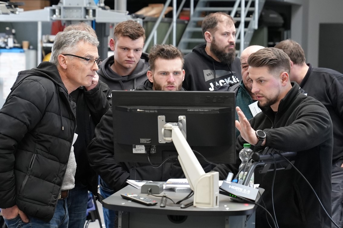 Neben zentral vermittelten Themen wird auch direkt am Fahrzeug gearbeitet. Ziel ist dabei, dass jeder Teilnehmer alle Funktionen mehrfach selber nutzt und ausführt, um die Umsetzung im eigenen Betrieb zu gewährleisten.